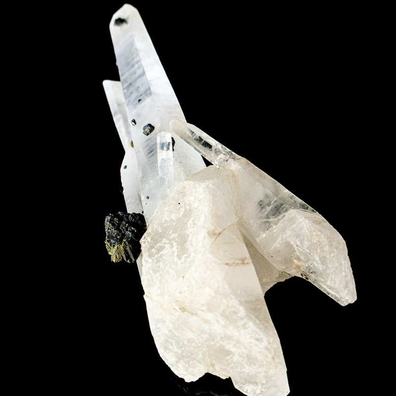 Een zeer bijzonder ex. uit onze collectie, deze zeer fraaie Magische Tweeling (twin) Laserkristal Binnen-Mongolië met Hematiet. Gave punten met enige witte calciet coating. De twee strak langs elkaar lopende kristallen (tweeling) hebben vanaf de basis een aangroei van moedergesteente kristal met een aanwas van twee kruislings omhoog wijzende kleinere langwerpige smalle kristallen. En als klap op de vuurpijl een mooie grote hematatiet kristallisatie met een ø van ca 2 cm.