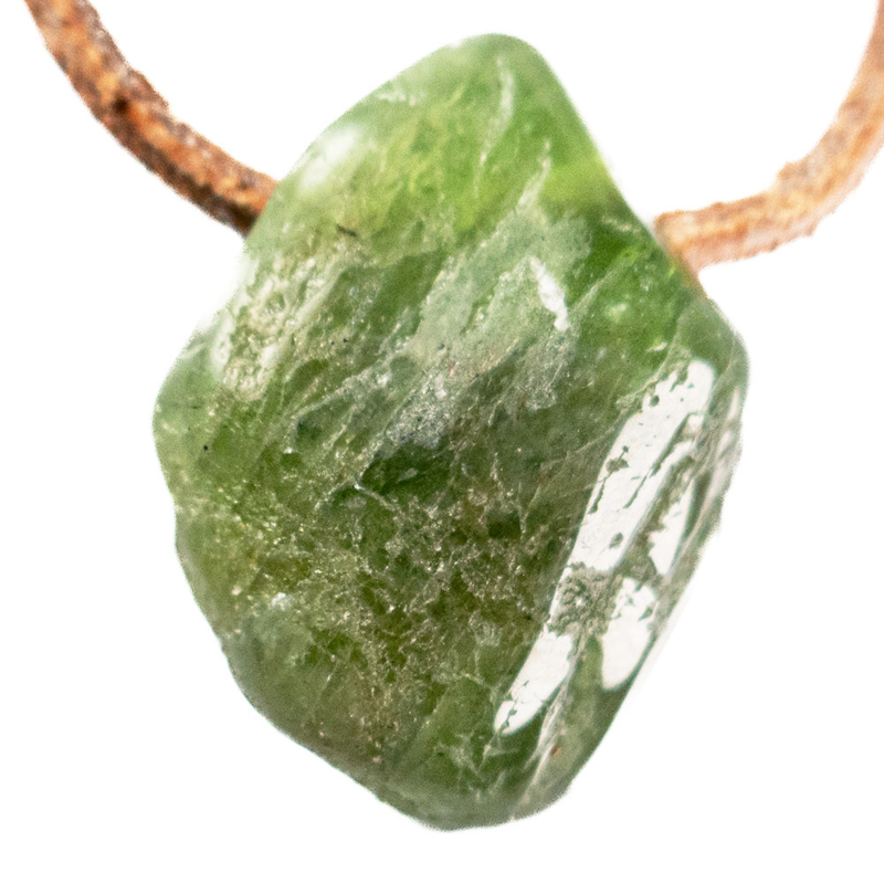 Exclusieve grote Peridoot, als geboorde hanger met deels fraaie doorschijnende (bovenkant) groene échte peridoot, deze grootte is zeer zeldzaam en eenmalig, iets bijzonders. Lengte 2,8 cm, breed 2 cm, dik 1,5 cm. Geleverd met stoere naturel leren veter.