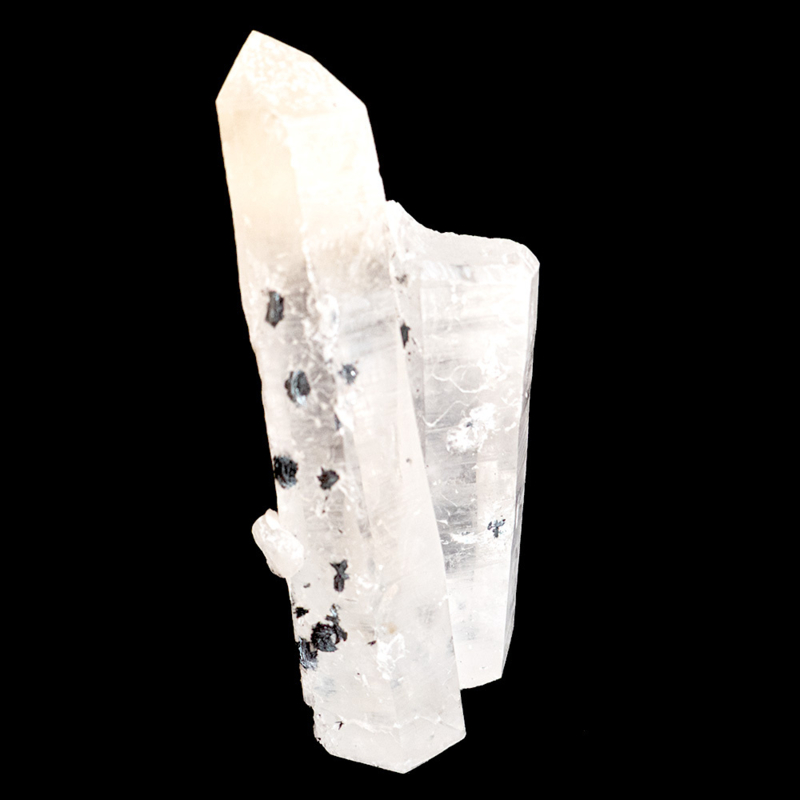 Fraai lemurisch laserkristal - met een zacht witte coating en hematiet uit Mongolië, fijne lemurische ribbeling op de vlakken, medium grootte, lengte ruim 10 cm, breedte onderzijde 5 cm, gewicht 0,19 kilo, op standvlak. Zeer zeldzaam lemurisch laserkristal van uitgezochte topkwaliteit.