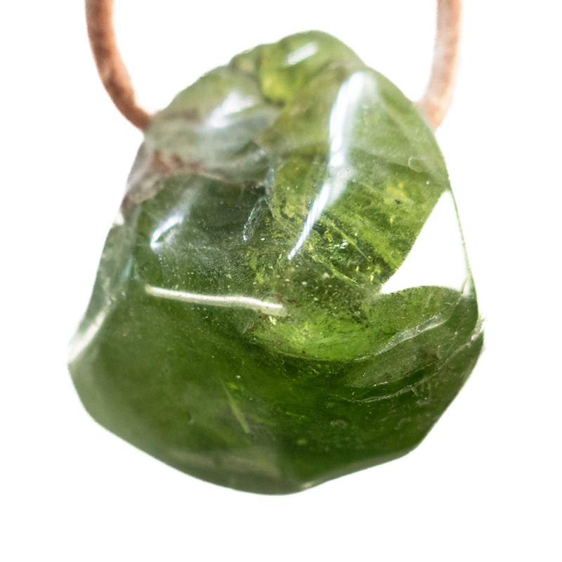 Exclusieve grote Peridoot, als geboorde hanger met een overwegend deel van fraaie doorschijnende groene échte peridoot, deze grootte is zeer zeldzaam en eenmalig, iets bijzonders. Lengte 2,8 cm, breed 2,6 cm, dik 2 cm.. Geleverd met stoere naturel leren veter.